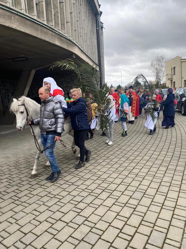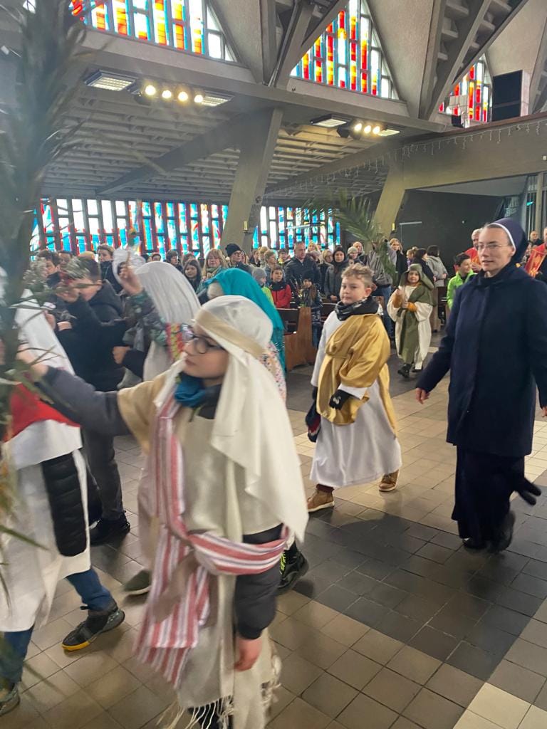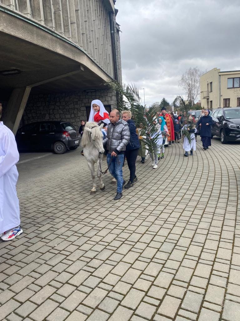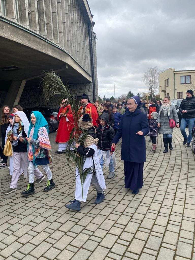 2022.04.10 Niedziela Palmowa. Msza św. z udziałem dzieci. Procesją wjazdu Jezusa do Jerozolimy. Wiele radości. Dziękujemy s. Edycie i Dzieciakom zaangażowanym we wcielenie się postaci P. Jezusa i Apostołów.